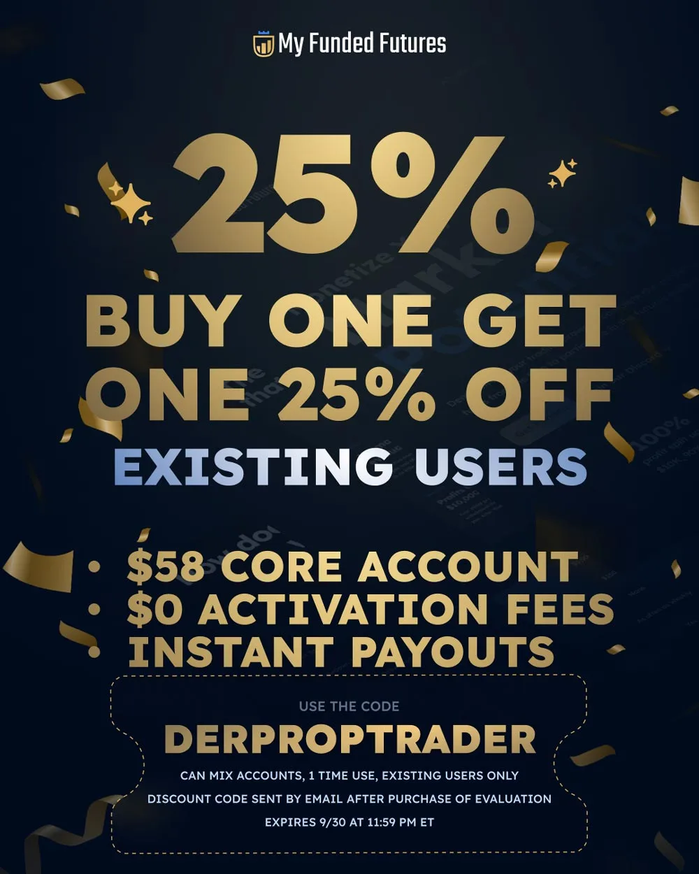 Für Neukunden bietet MyFundedFutures zur Zeit einen Rabatt von 50% an. Das wäre für einen 50k Core-Account nur 39$ ohne Aktivierungsgebühr. Der Rabatt gilt für alle Kontotypen für einen Kauf.